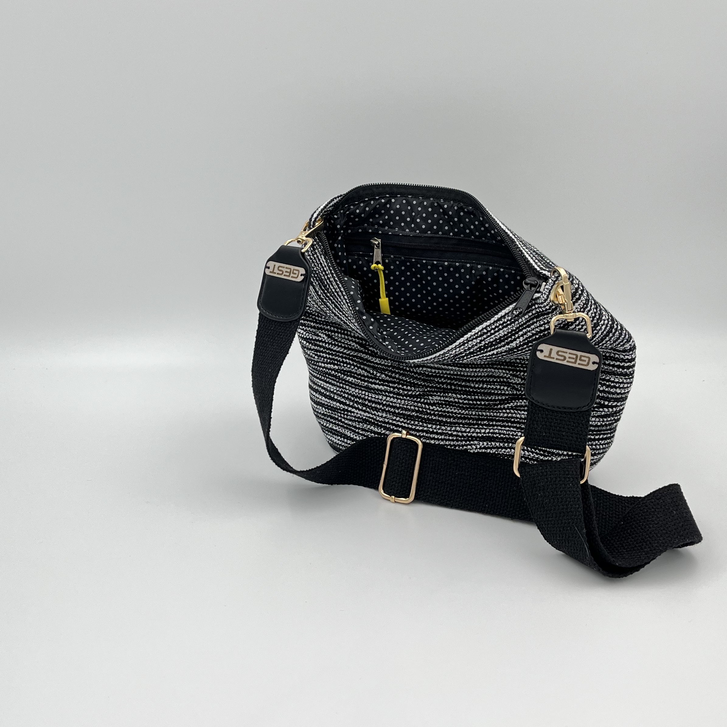 Torebka typu klasycznego, dość duża. Wykonana ze sznurka bawełnianego (5mm) z rdzeniem poliestrowym. W środku wykończona podszewką koloru czarnego w białe kropki, w której znajduje się kieszeń zapinana na zamek. Pasek czarny miękki. Torebka w całości ręcznie robiona, unikatowa dostępna w jednym egzemplarzu.